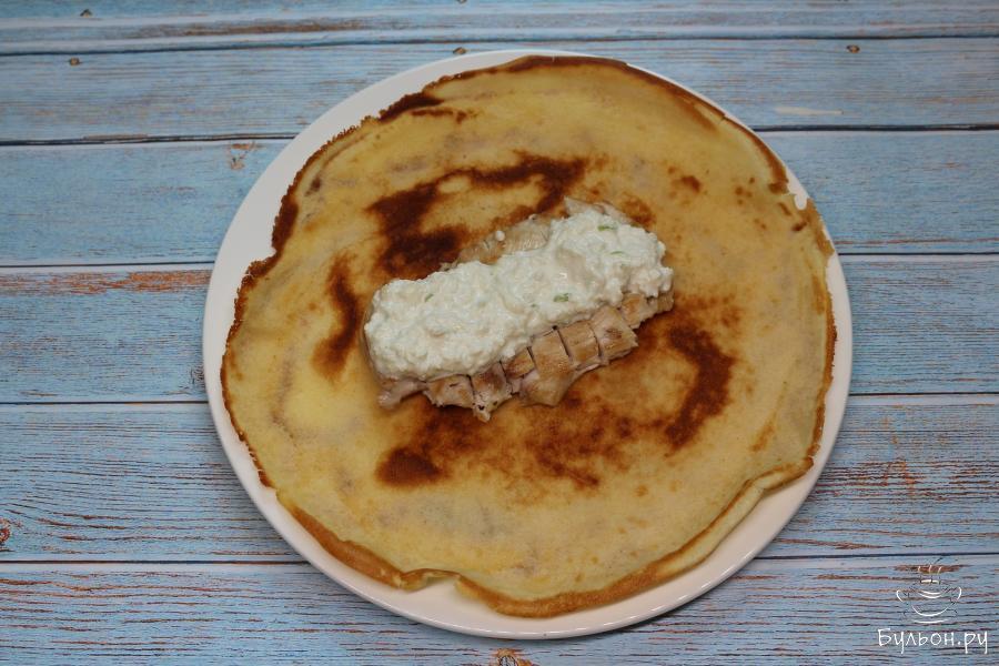 Блины с куриной грудкой и сметанно-яблочным соусом - имеют необычное и пикантное, но при этом вкусное сочетание нейтрального по вкусу блина, куриного мяса, и яркого, и одновременно сливочного, кислого и острого вкуса соуса. Блины сытные, поэтому их лучше готовить и подавать на обед или ужин. При приготовлении соуса, сметану необходимо использовать жирную, не менее 20 процентов, так как яблоки дают сок и в итоге соус может получится слишком жидкий. Яблоки следует брать зеленые и твердые, чтобы их сорт был кисленьким.