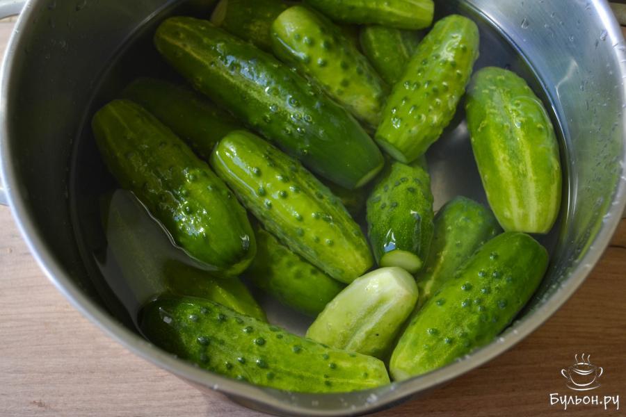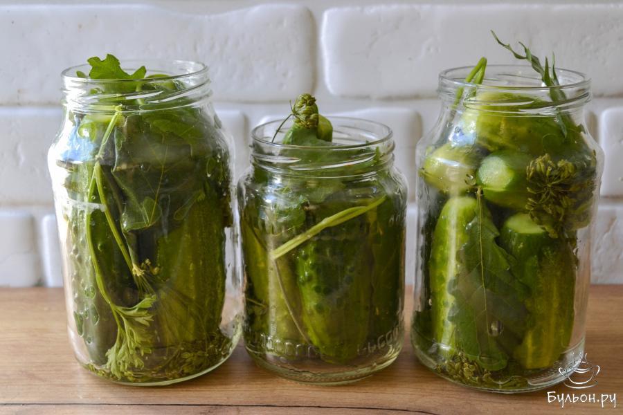 4. Залейте в банки кипящую воду и прикройте их крышами. Оставьте на 30 минут, чтобы огурцы прогрелись.