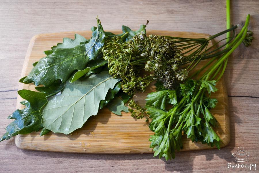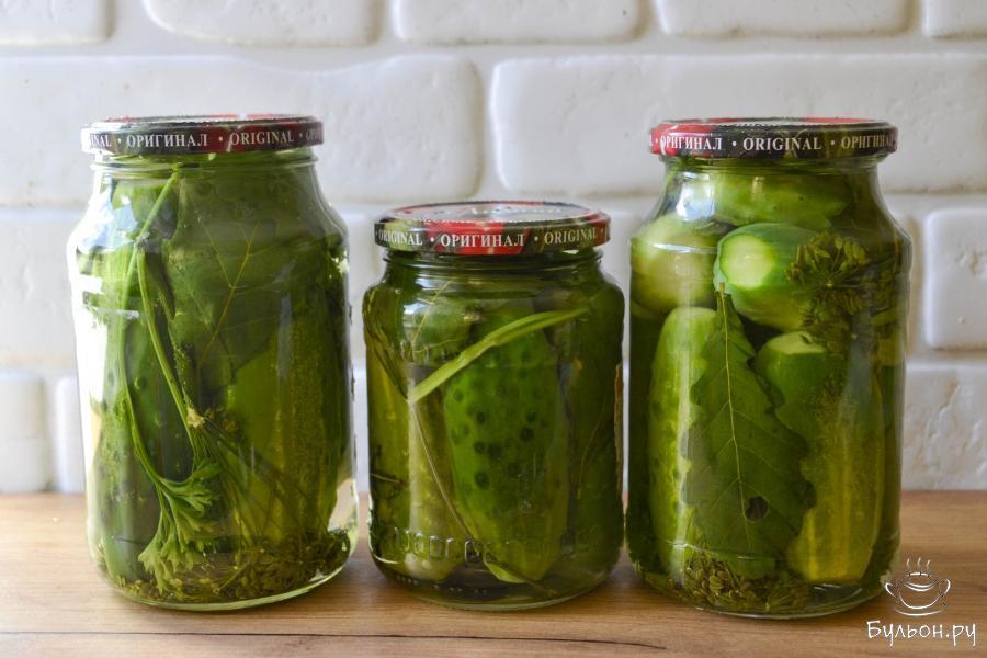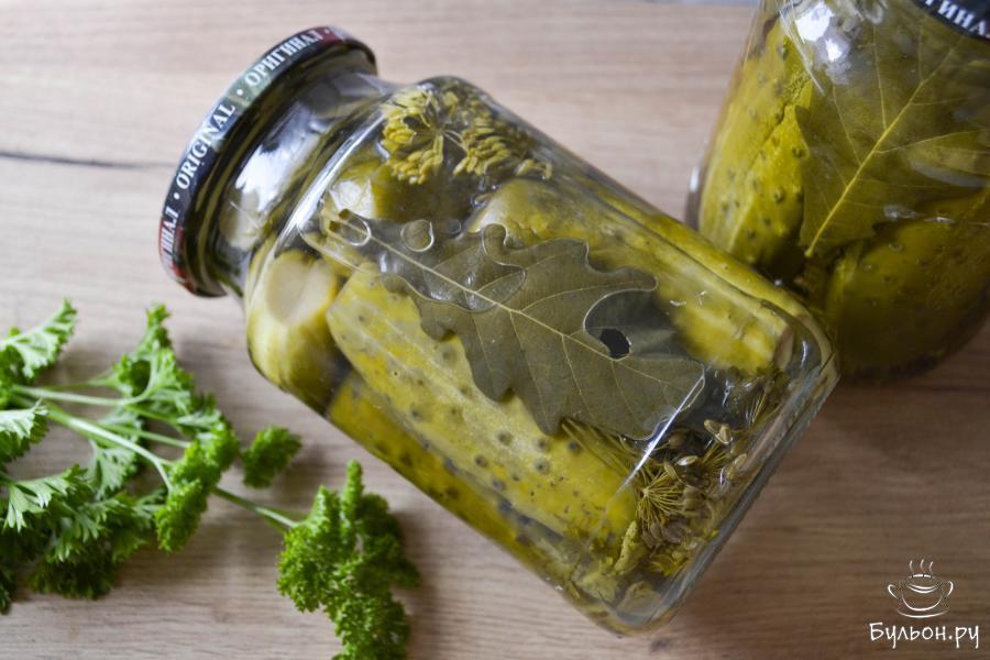 Пожалуй, каждая хозяйка имеет свой фирменный рецепт маринованных огурцов. Я не исключение. У меня их несколько. Один из любимых рецептов - огурцы с дубовыми листьями. Огурчики получаются очень вкусные, а главное, плотные и хрустящие. Лучше использовать огурцы небольшого размера. По желанию в каждую банку можно положить любимые ароматные травы, чеснок, острый перец, бутоны гвоздики и черный перец горошек. Расход продуктов дан на трехлитровую банку.