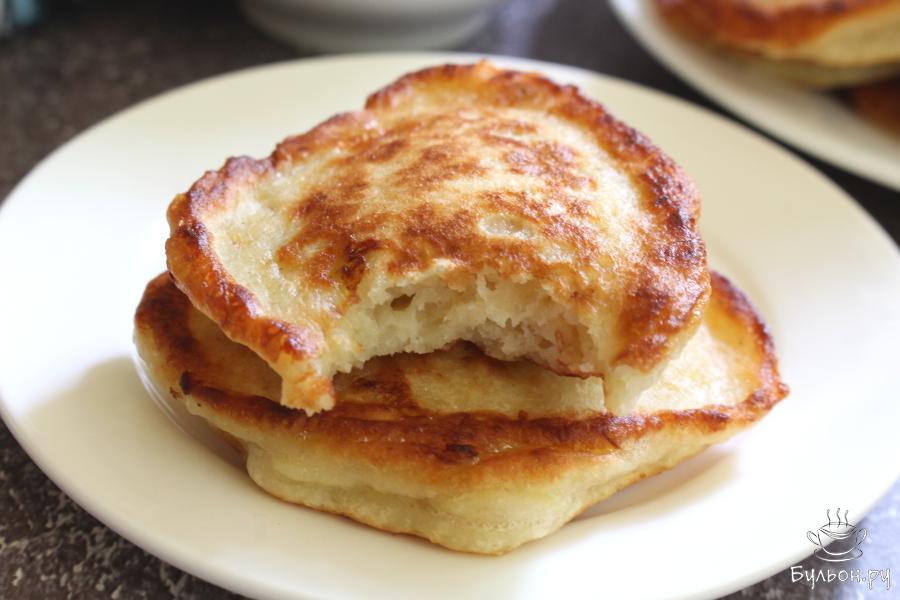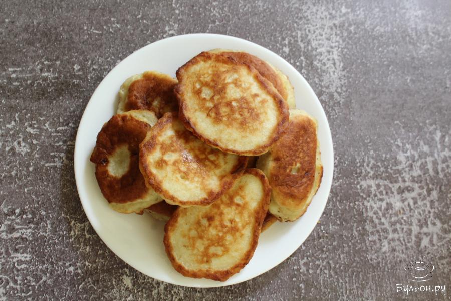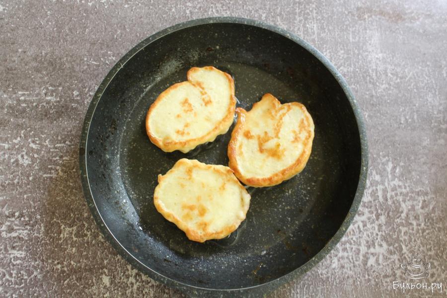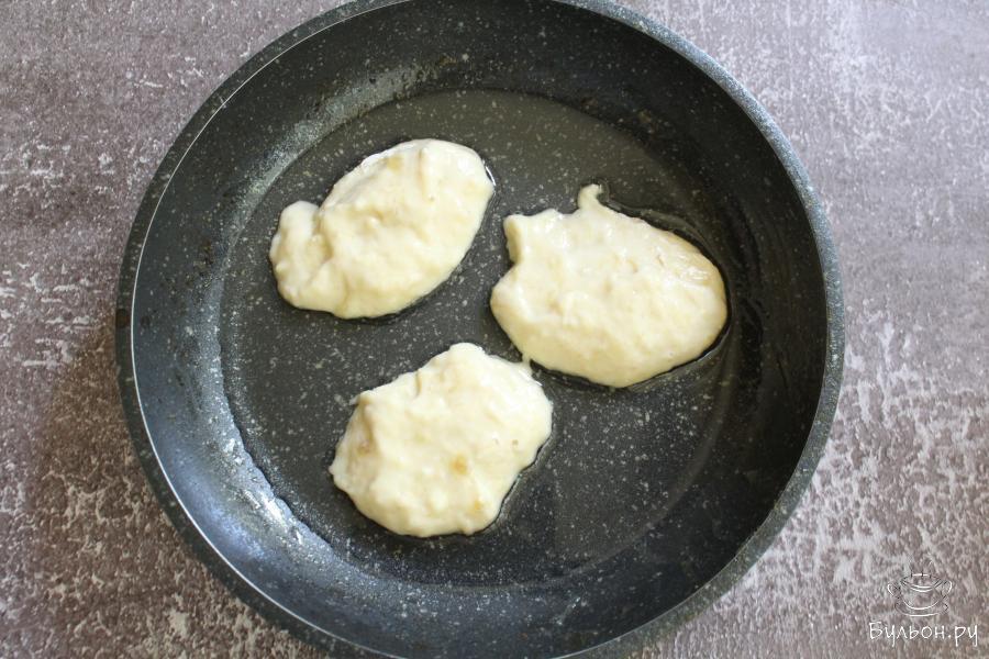 5. На сковороде разогреть масло. Выкладывать оладьи на сковороду столовой ложкой и жарить оладьи до румяного цвета.