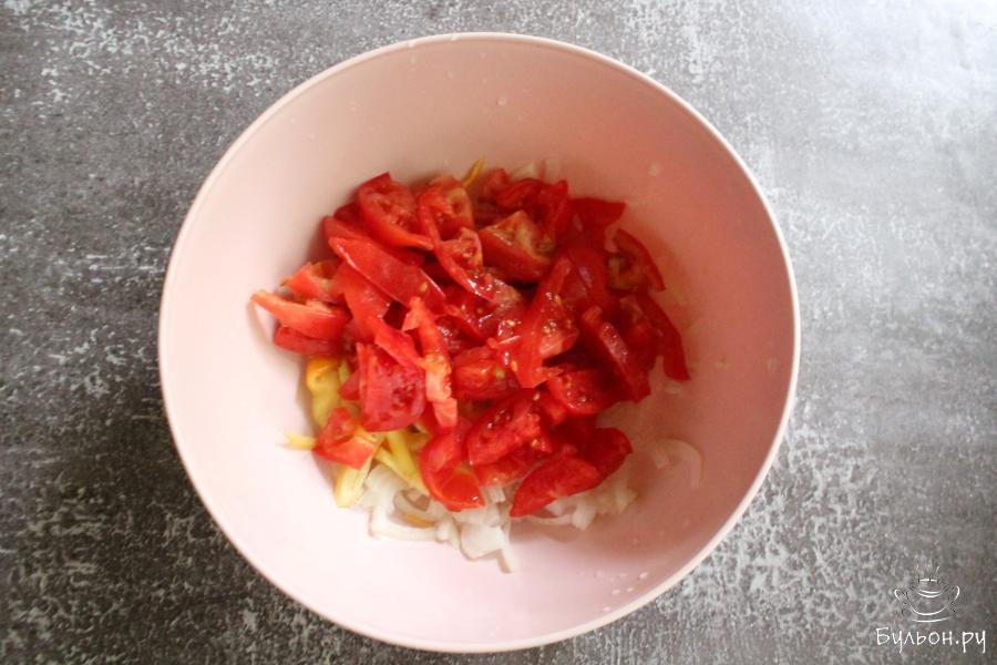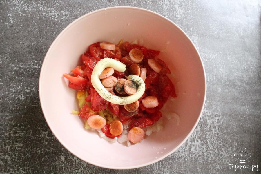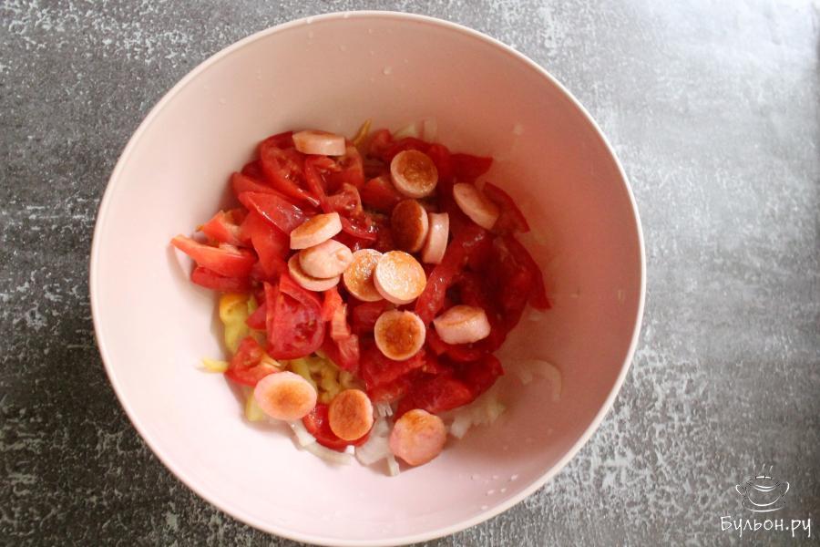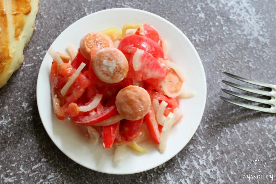 Салат с помидорами, перцами и с жареными сосисками - хоть и овощной салат, но благодаря добавлению жареных сосисок он получается достаточно сытный. Этот салат можно заправить майонезом, а можно и сметаной - это по желанию. Если вы любите салаты с зеленью, то и этот салат вполне можно дополнить мелко нарезанной, любимой зеленью. Салат порадует вас своим вкусом, он сочный, легкий, необычный и очень вкусный.