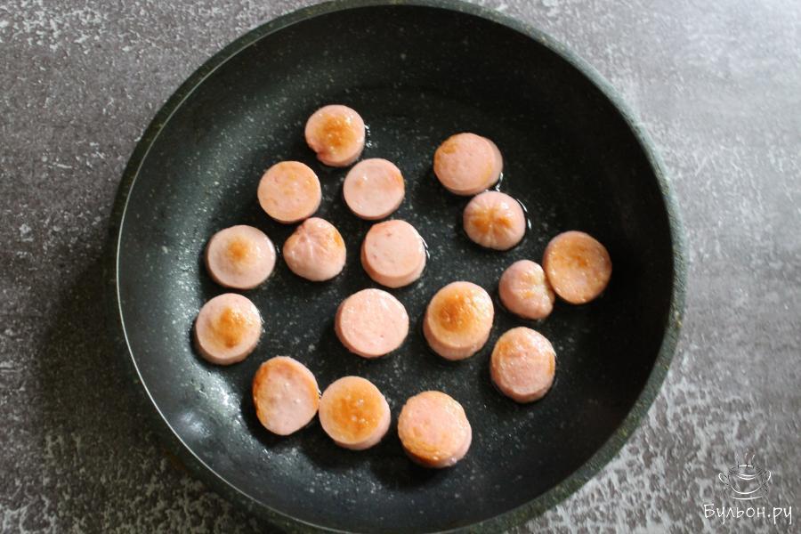 1. Сосиски нарезать не сильно тонкими кружочками и обжарить их на сковороде с разогретым маслом, до румяности, с двух сторон.