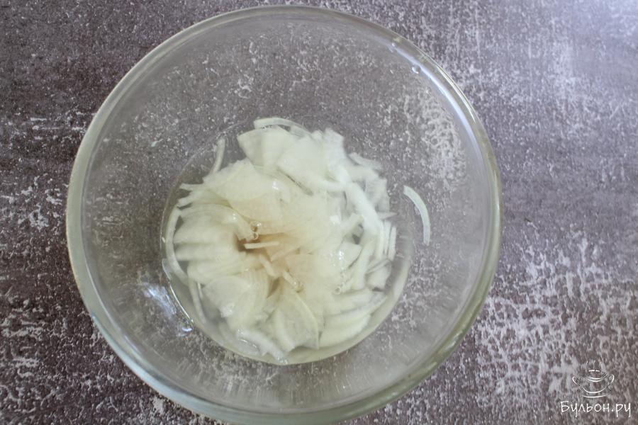2. Пока картофель и яйца варятся, почистить и промыть лук. Тонко нашинковать лук, залить его водой, добавить уксус и перемешать. Оставить лук мариноваться.