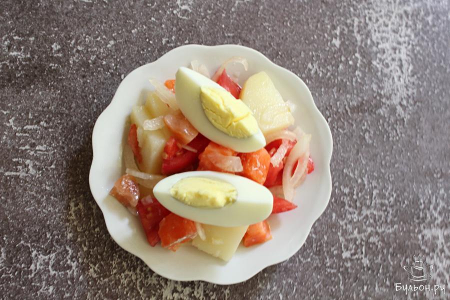 7. Салат выложить порционно. Яйцо разрезать на две или четыре части и украсить каждую порцию салата.