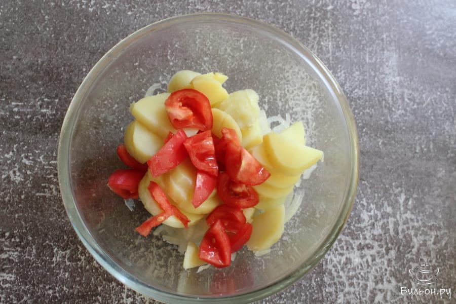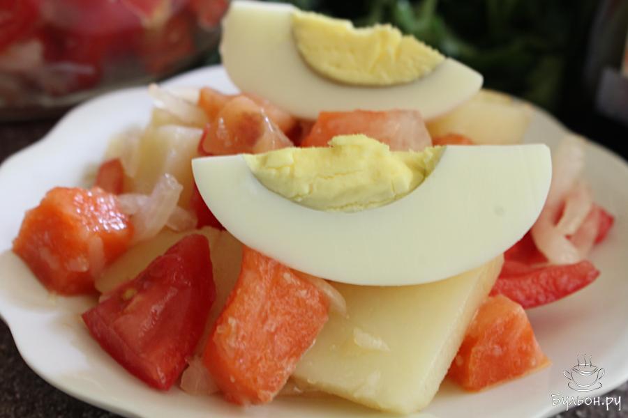 Картофельный салат с лососем, помидорами и яйцом - получается сытный, вкусный, нежный и насыщенный. Порцией такого салата, вполне, можно заменить легкий ужин. Салат готовится просто. Такой салат можно нарезать крупно, можно наоборот - нарезать все ингредиенты мельче. Дольки вареного яйца можно выложить каждому порционно, а можно нарезать вареные яйца мельче и перемешать с салатом. Помидоры для приготовления выбирайте небольшие, плотные, сладкие, вполне можно использовать помидоры черри.