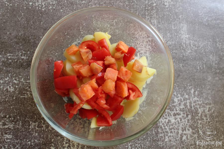 4. Помидоры промыть, обсушить, нарезать крупными кубиками. Если помидоры сильно водянистые, то семена лучше убрать.