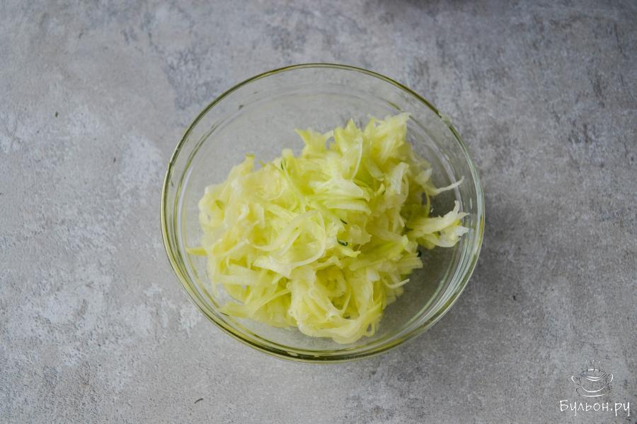 2. Кабачок очистите от кожуры и натрите на крупной терке. Оставьте на несколько минут, чтобы кабачок дал сок.