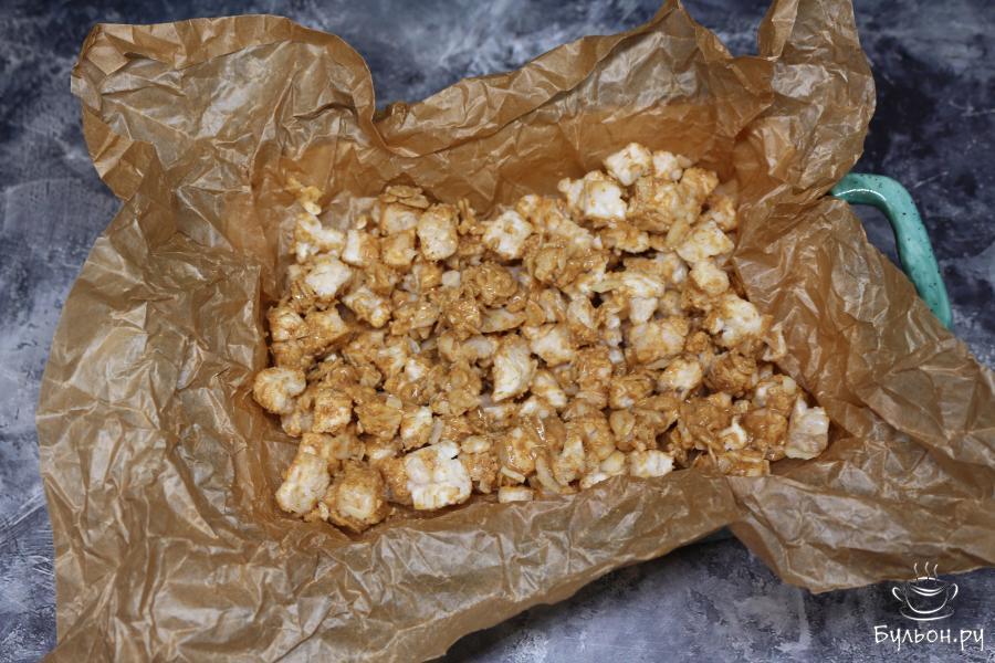 4. В емкость для запекания выложите пергаментную бумагу. На нее выложите будущую гранолу. Запекайте гранолу при 180 градусах в течение 15 минут.