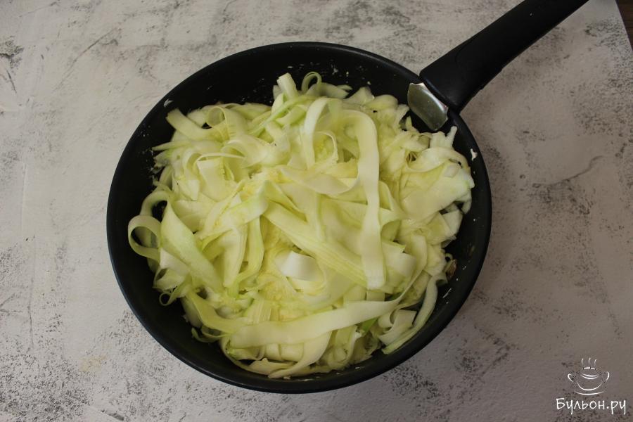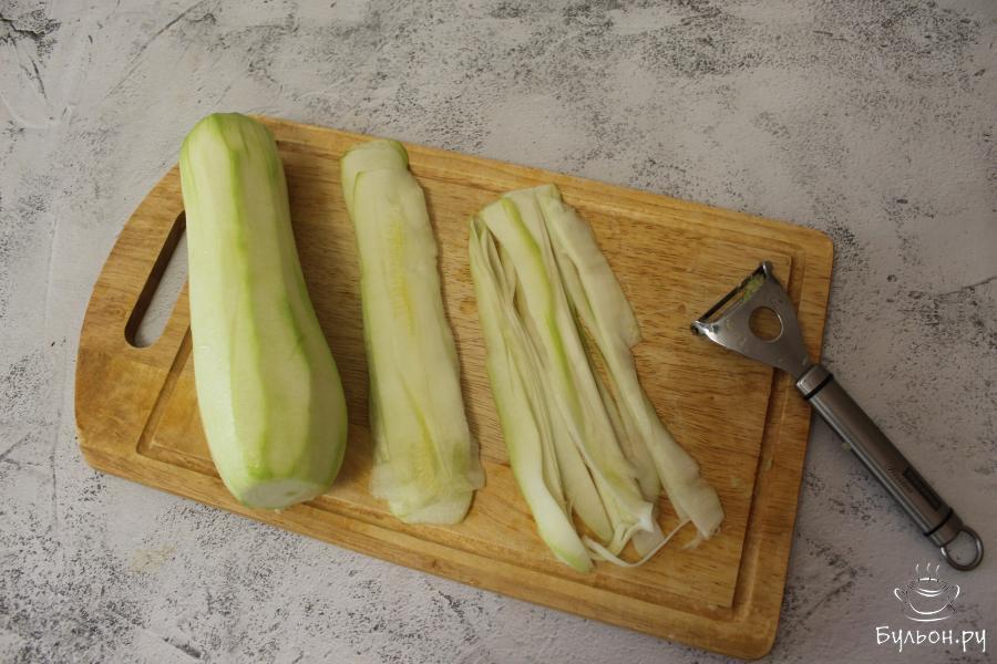 1. Кабачок промыть, очистить и с помощью овощечистки тонко нашинковать на слайсы. Слайсы выложить друг на друга и нарезать на длинные спагетти.