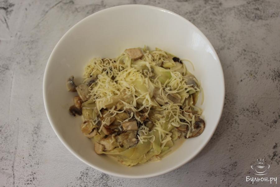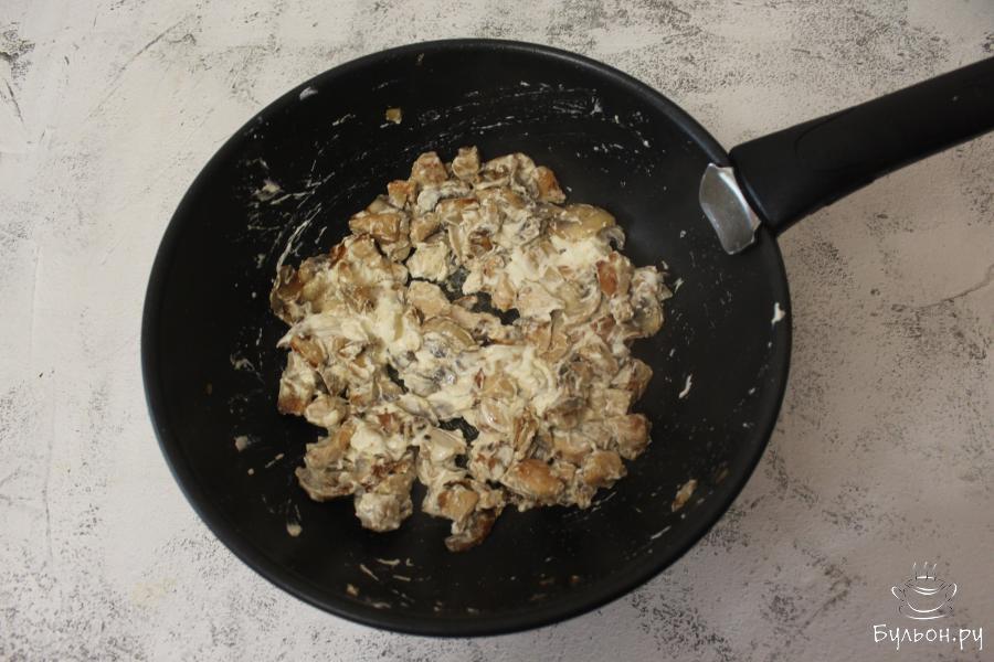 3. На ароматном масле до мягкости обжарить кусочки куриного филе. Затем добавить нашинкованные пластинами шампиньоны и еще немного обжарить. Добавить творожный сыр, посолить и перемешать.