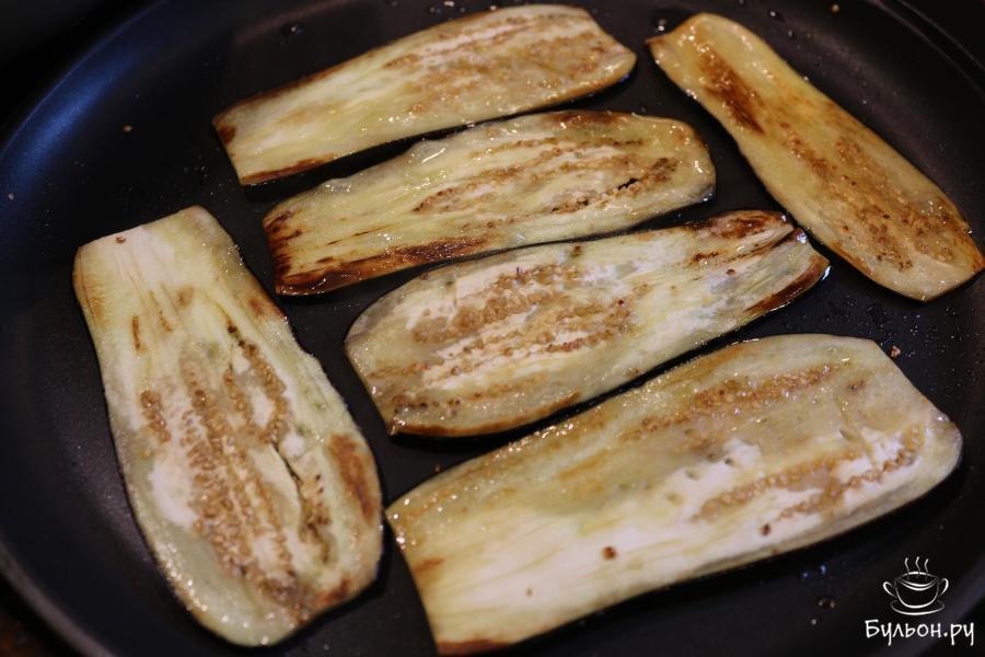 4. Теперь на сковороде с малом обжарьте ломтики баклажана с двух сторон, до золотистого цвета. Выложите на салфетки, чтобы убрать лишний жир и, чтобы баклажаны остыли.