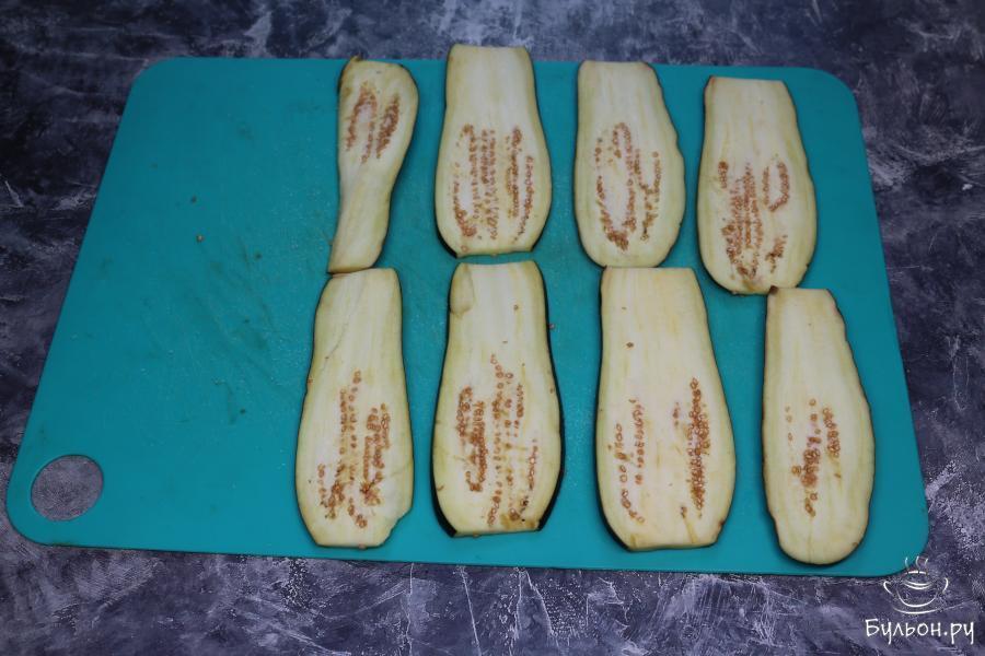 1. Срежьте у баклажана хвостики. Нарежьте его тонкими пластинами, посолите и оставьте баклажаны на 10 минут.
