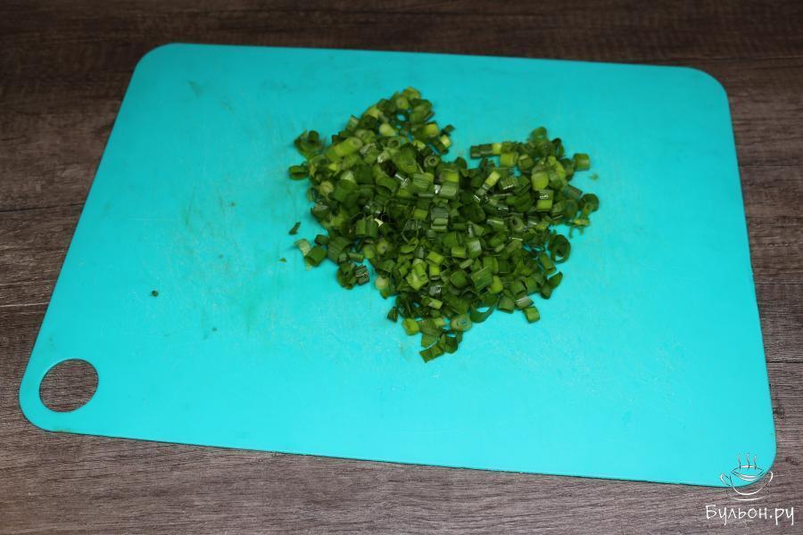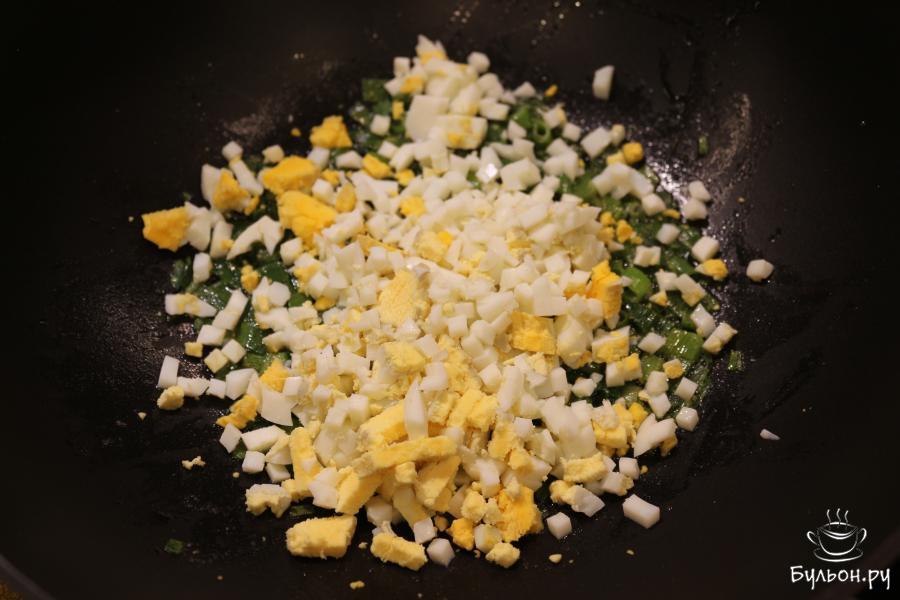3. Заранее сварите яйца в кипящей воде в течение 15 минут. Затем очистите их от скорлупы и мелко нарежьте на кубики. Добавьте к луку, посолите, перемешайте и обжарьте еще 3 минуты вместе.
