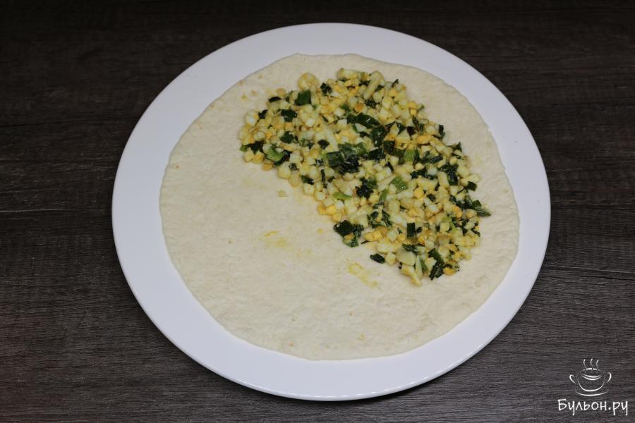 4. На половину тортильи, выложите половинку начинки. Края лепешки хорошо промажьте водой. Сверните лепешку пополам. Защепите края, удалив полностью воздух. Проделайте эту процедуру со второй лепешкой.
