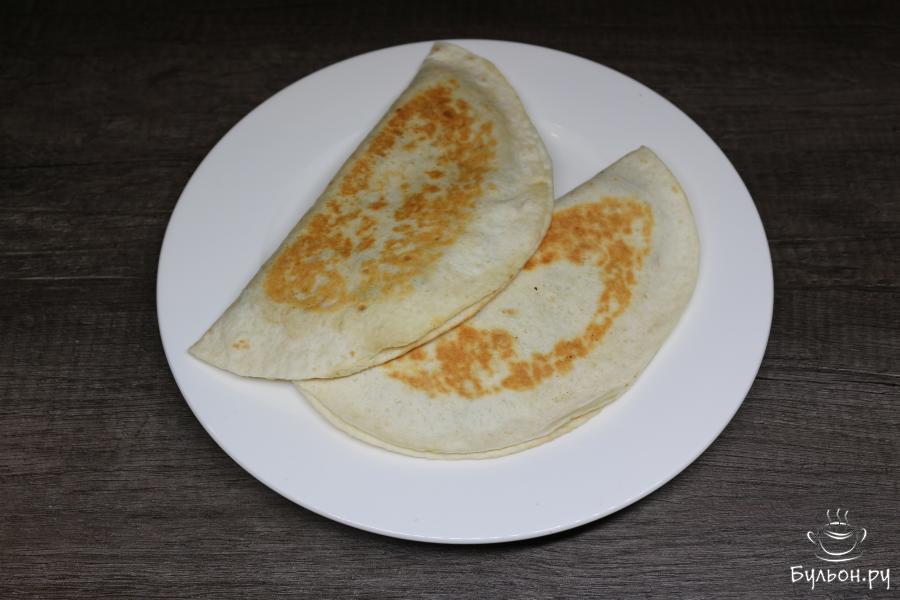 5. Выложите на сковороду оставшееся масло, растопите его и обжарьте с двух сторон тортильи с начинкой.