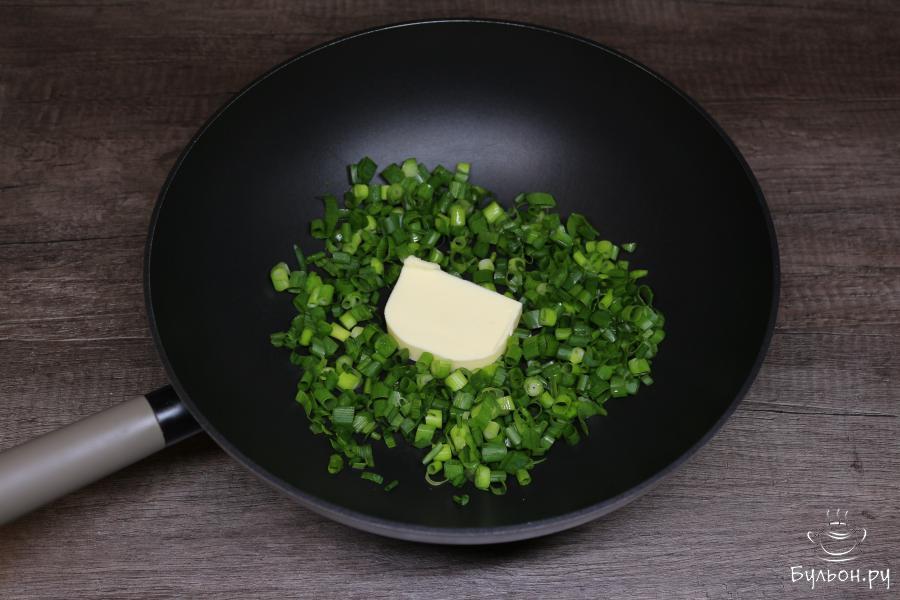 2. В сковороду выложите 25 грамм сливочного масла и нарезанный лук. Обжарьте лук в масле до мягкости.