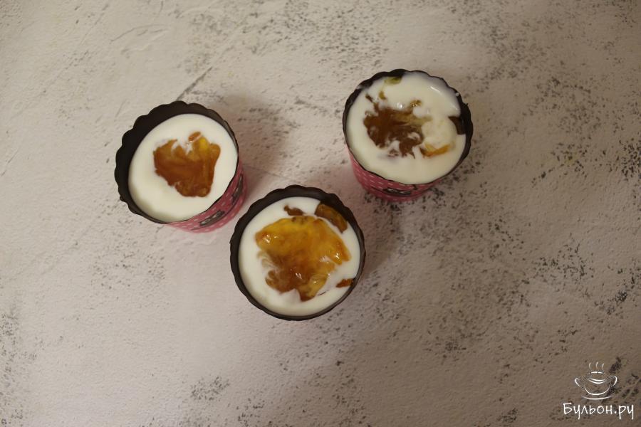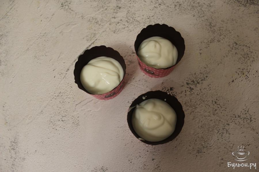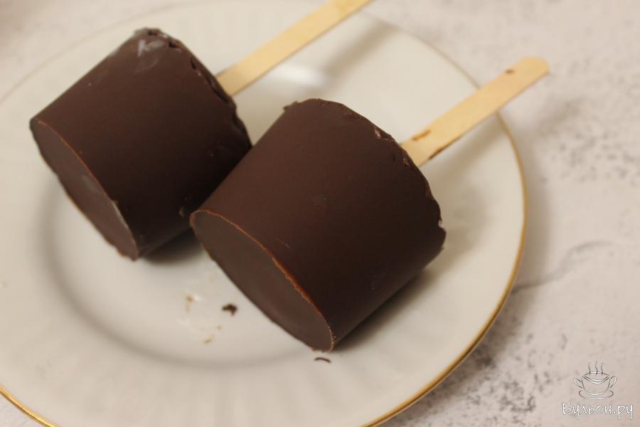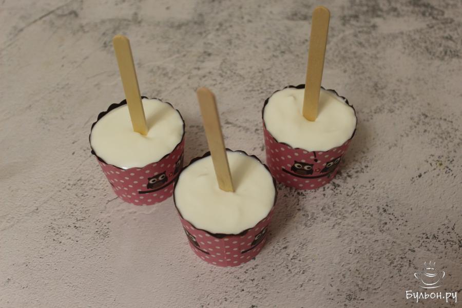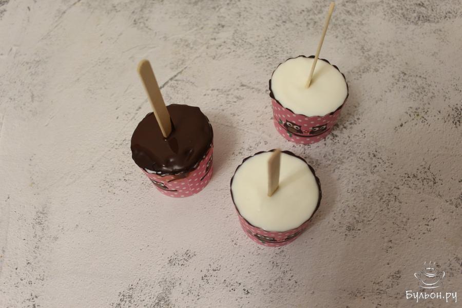 5. Достаньте формочки с замершим йогуртом, залейте сверху растопленным шоколадом и уберите формочки в морозилку еще на 10 минут.