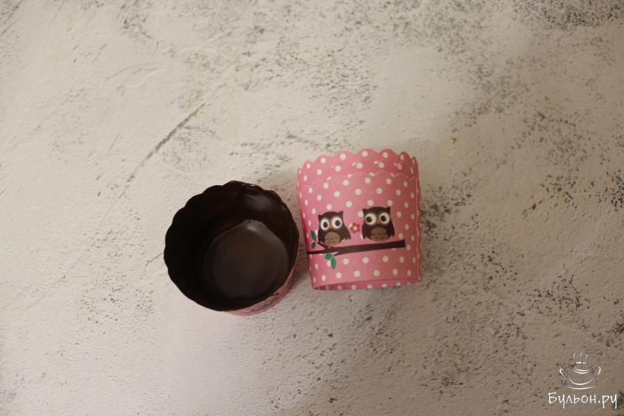1. На паровой бане растопите шоколад, в каждую формочку влейте шоколад, круговыми движения распределите шоколад по всем стенкам и дну формочек, переверните формы и дайте стечь лишнему шоколаду. Уберите формочки в морозилку на 10 минут.