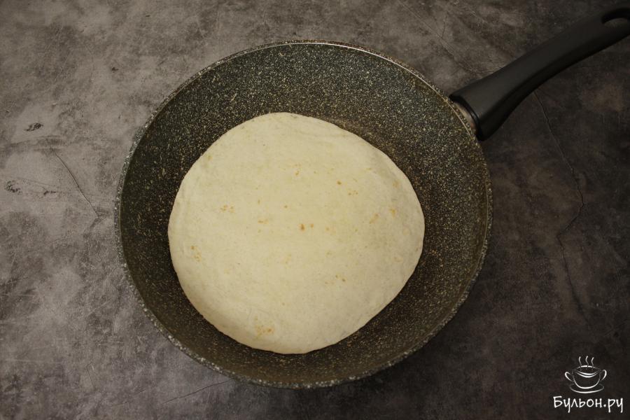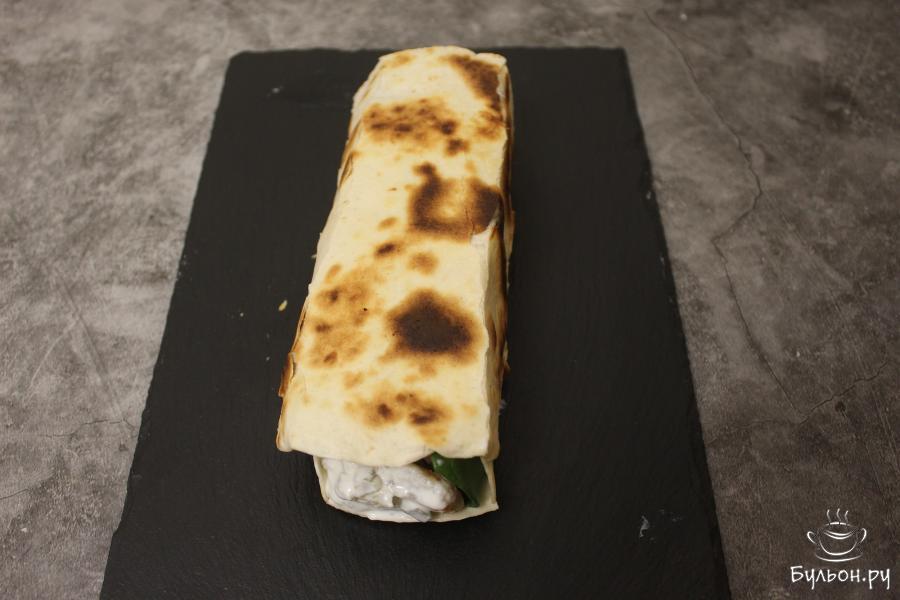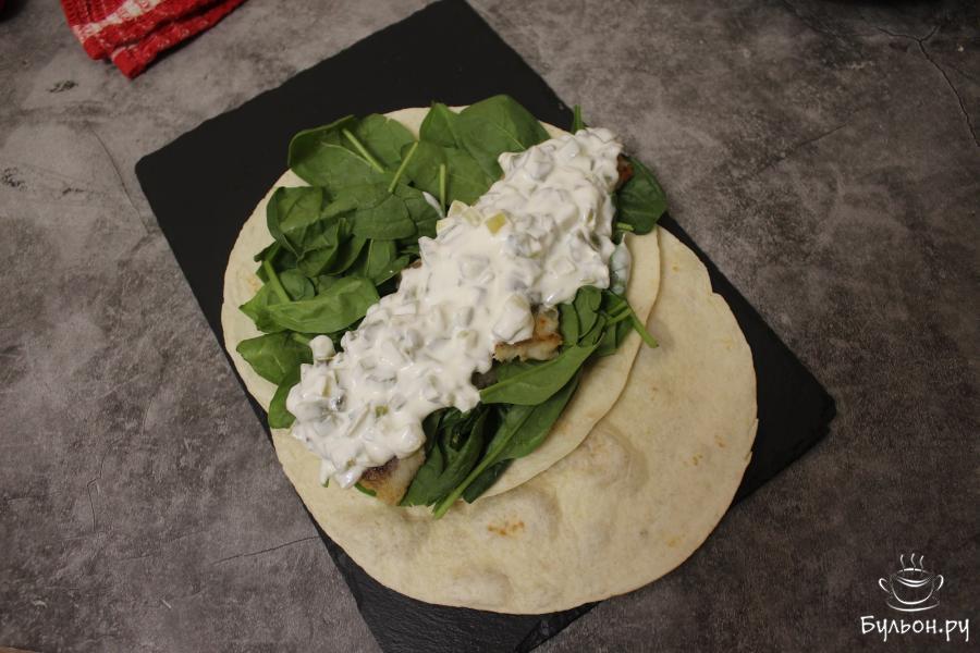 4. Смешать натуральный йогурт с мелко нарезанными маринованными огурцами и выложить соус на рыбу. Под первую лепешку выложить вторую подогретую лепешку.