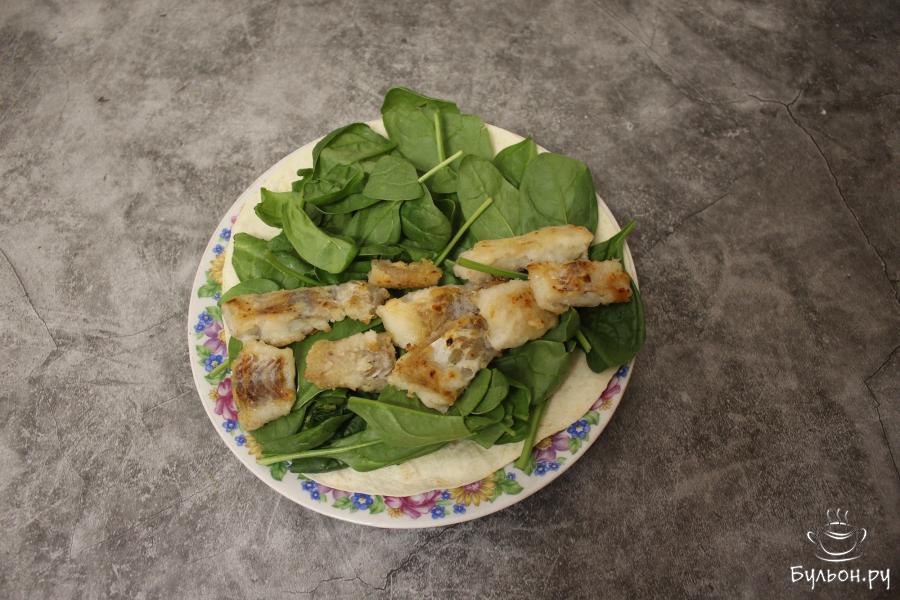 Завернутые в лепешки овощи с мясом и рыбой очень популярны во всем мире. Это очень вкусно, а ко всему прочему - очень удобно есть, особенно, если вы кушаете на улице. Сегодня я предлагаю приготовить лепешку со шпинатом и минтаем. Данный ролл не вредный, поскольку в нем не содержится майонезных соусов, вместо этого используется натуральный йогурт, перемешанный с мелко нарезанными маринованными огурцами.