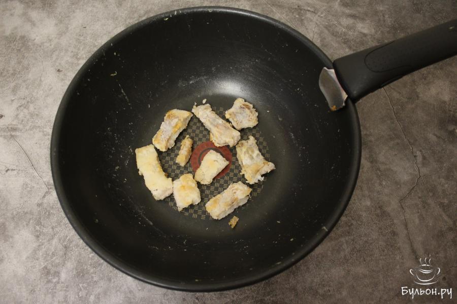 1. Филе минтая промойте, обсушите бумажными полотенцами, нарежьте на кусочки, посолите и обваляйте в рисовой муке. Выложите запанированные кусочки минтая на разогретую с маслом сковороду и обжарьте с двух сторон до золотистого цвета.