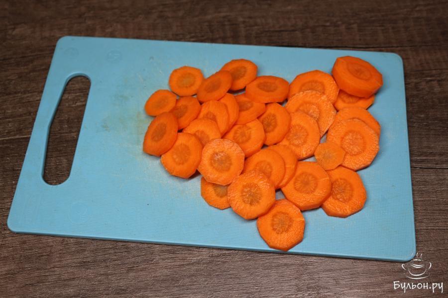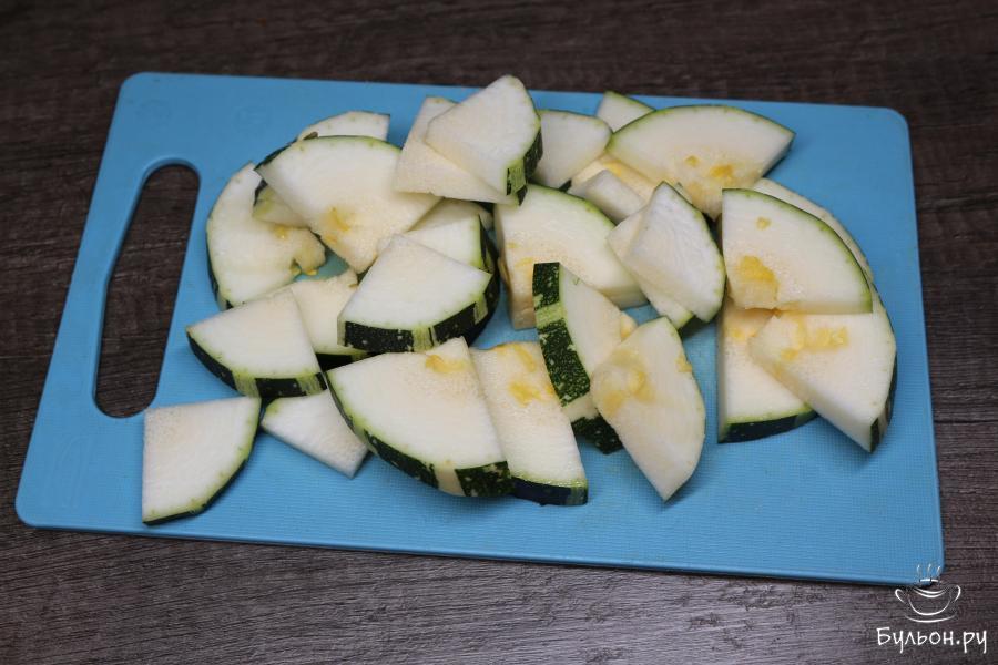 3. Кабачок порежьте в начале кружочками, затем разрежьте кружочки на 2 или 4 части в зависимости от диаметра кабачка.