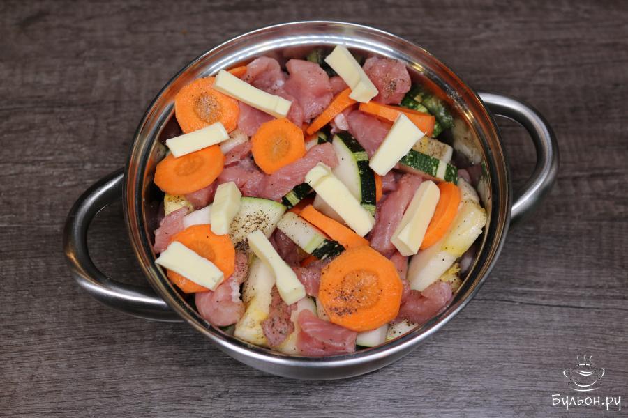 4. В кастрюльку выложите кусочки свинины, затем овощи. Влейте воду, посолите, поперчите, перемешайте. Добавьте сливочное масло. Поставьте кастрюлю на плиту, накройте крышкой и готовьте мясо таким образом 1,5 часа так, чтобы блюдо кипело, но не сильно.