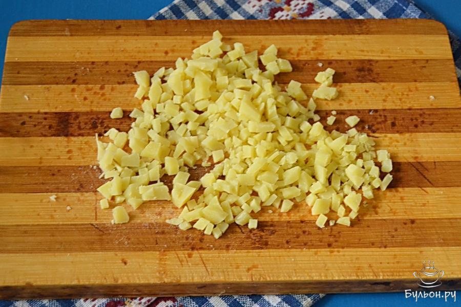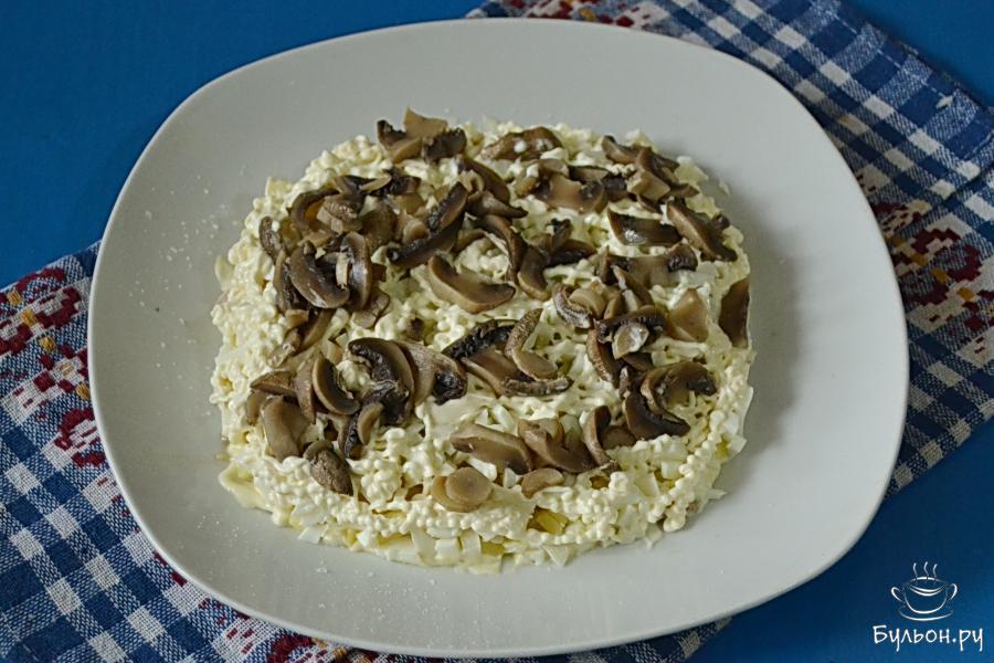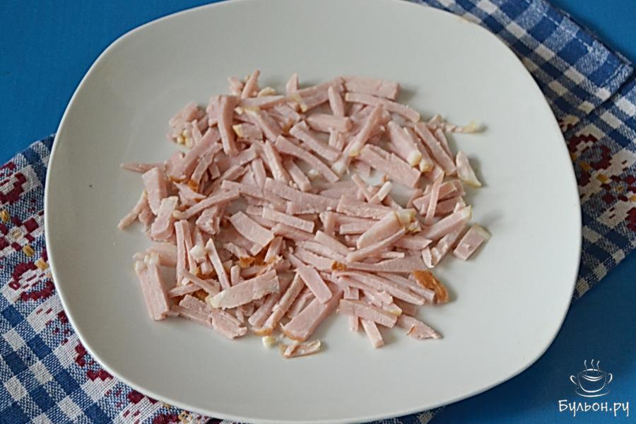 5. Поверх ветчины уложим картофель. Все компоненты салата будем располагать слоями друг на друге, промазывая каждый майонезом.