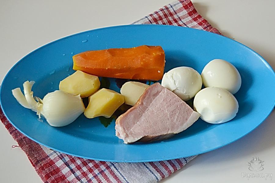 1. Начнем с подготовки ингредиентов: сварим морковку, яйца, картошку. Почистим. Отдельно сварим шампиньоны, буквально минут 15 в кипятке.