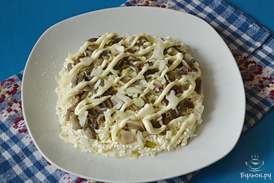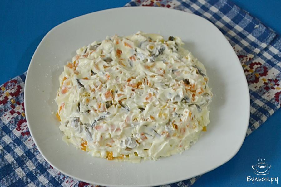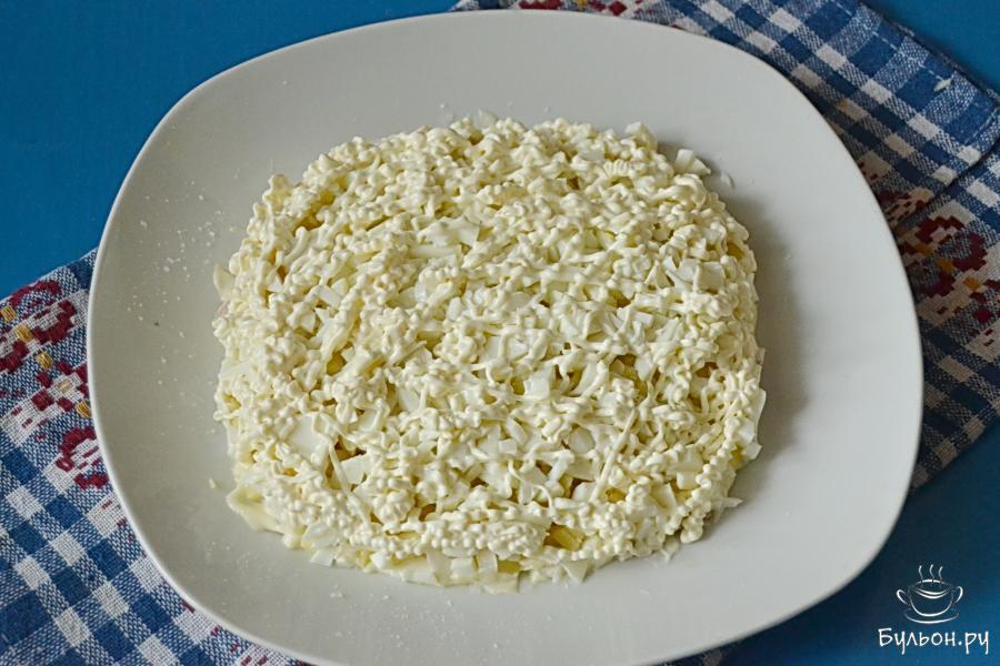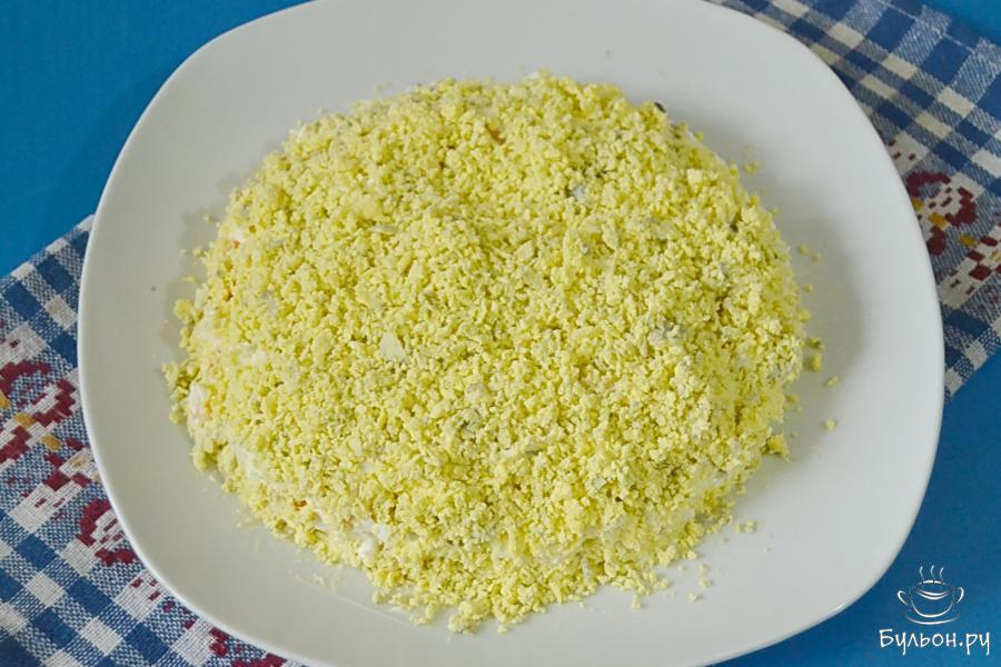 12. И наконец - верхний слой. Яичные желтки теперь уже не режем, а крошим. И эту крошку наносим на самый верх.