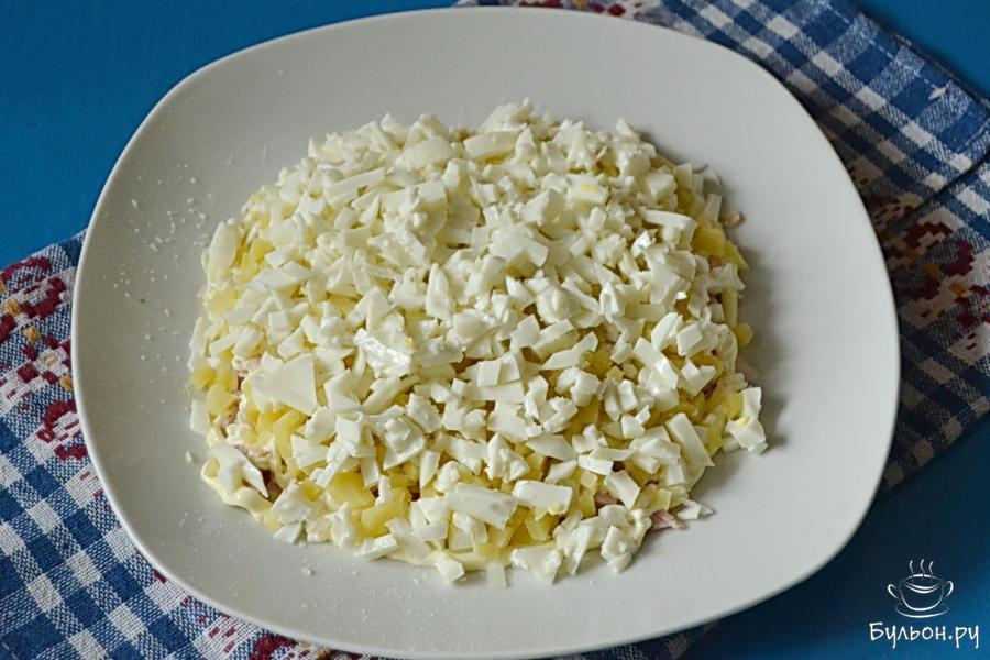 6. Картошку немного подсолим, чтобы салат не получился пресноватым. На картошку выложим яичные белки (желтки оставим для верхнего слоя), тоже подсолим.