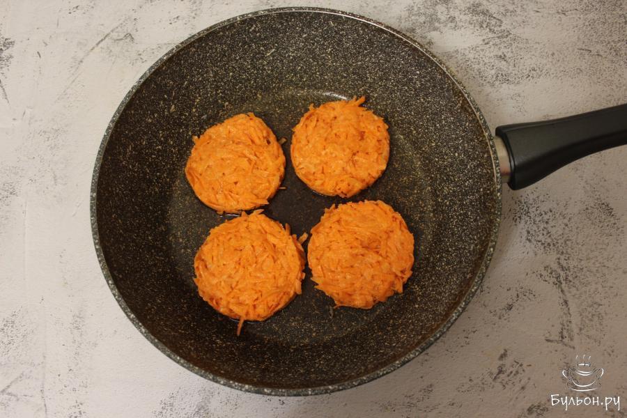 4. На сковороде хорошо прогрейте оливковое масло, затем снизьте огонь до среднего, ложкой выложите на сковороду драники, обжарьте их с двух сторон до образования красивой корочки.