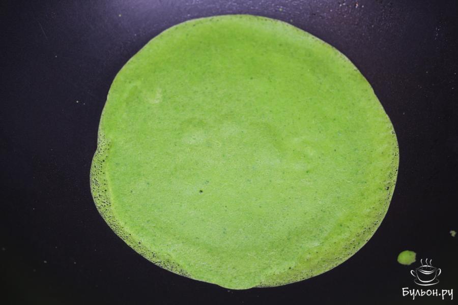 3. Смажьте сковороду сливочным маслом, для приготовления первого блинчика. Влейте из чаши блендера шпинатное блинное тесто на разогретую сковороду и выпекайте.
