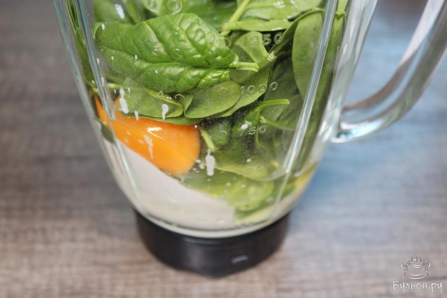 1. В чашу блендера влейте молоко, просейте муку, добавьте листья шпината и щепотку соли, вбейте яйцо.