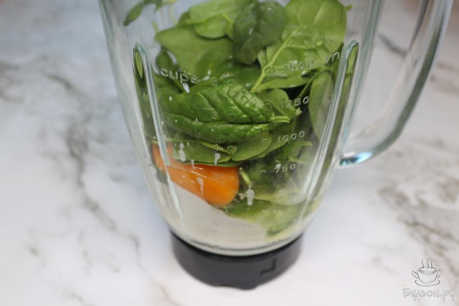 1. В чашу блендера влейте молоко, просейте муку, добавьте листья шпината и щепотку соли, вбейте яйцо.