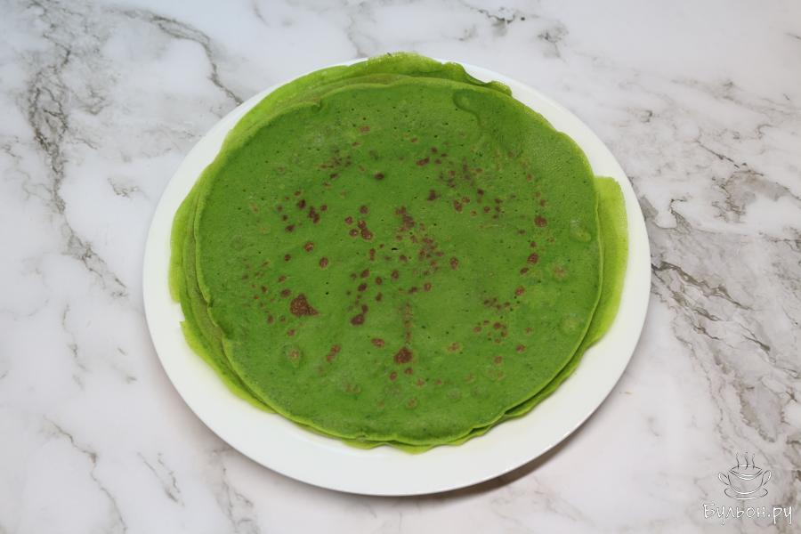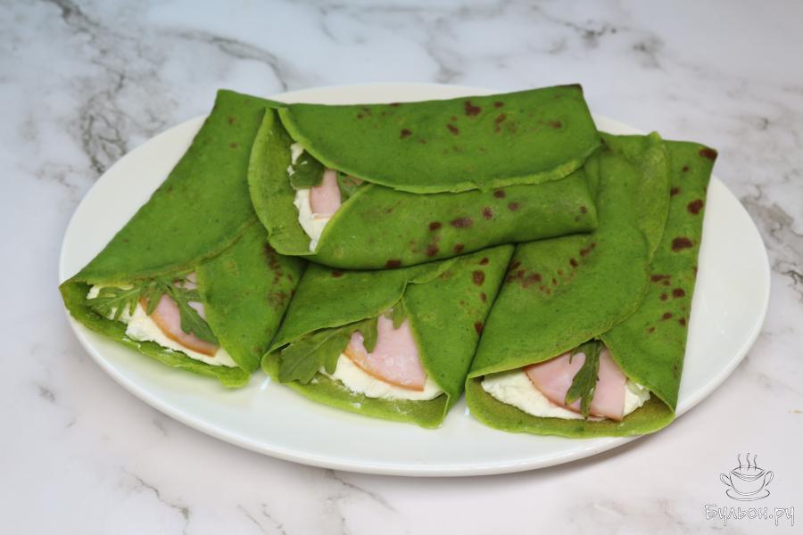 Шпинатные блины со сливочным сыром, карбонатом и рукколой - станут полезным, питательным, ярким, вкусным приемом пищи. На самом деле, такие овощные блины можно готовить с абсолютно другими, солеными, сытными начинками. Например - это может быть сметана, сыр, слабосоленая рыбка, красная рыба, запеченная в духовке, овощи и зелень с творожным сыром и многие другие варианты. Такие блины подойдут на завтрак и на обед, на перекус и на ужин. У меня получилось 8 блинчиков, половину из них я приготовила с начинкой.