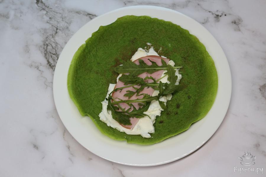 5. В центр блина выложите сливочный сыр и размажьте его так, чтобы с трех сторон блин был без начинки. На сыр положите половинку кусочка карбоната, сверху выложите немного рукколы.