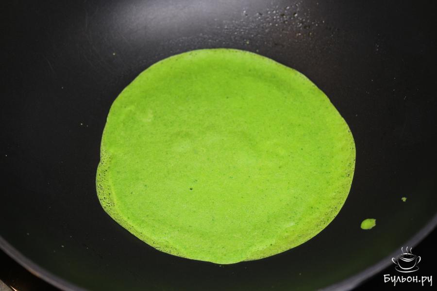 3. Для приготовления первого блинчика, смажьте сковороду сливочным маслом. Из чаши блендера влейте шпинатное блинное тесто на разогретую сковороду и выпекайте.