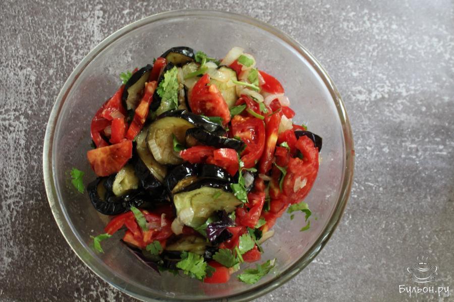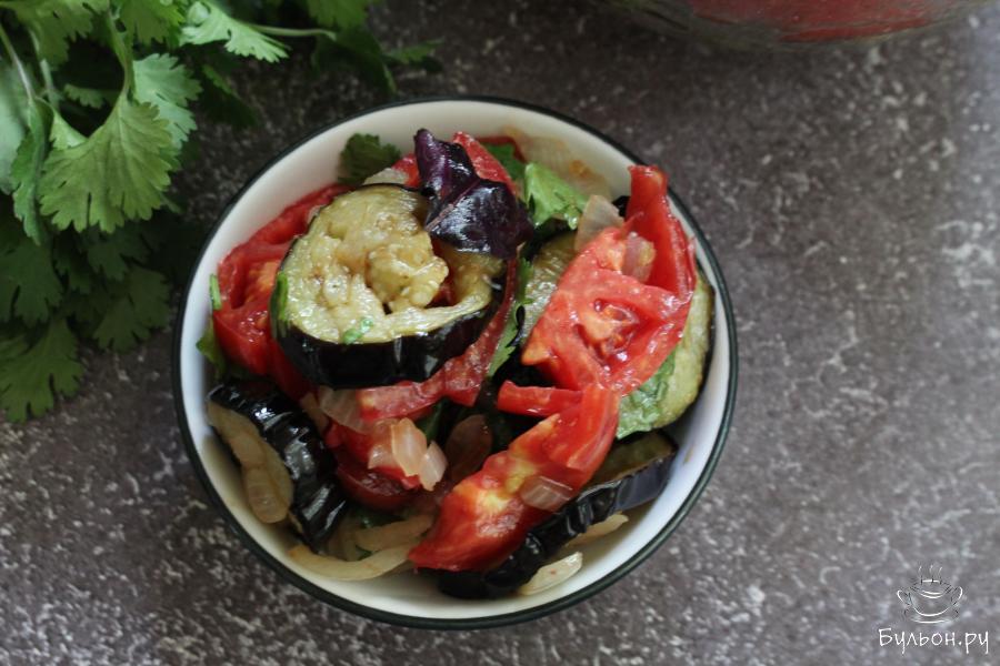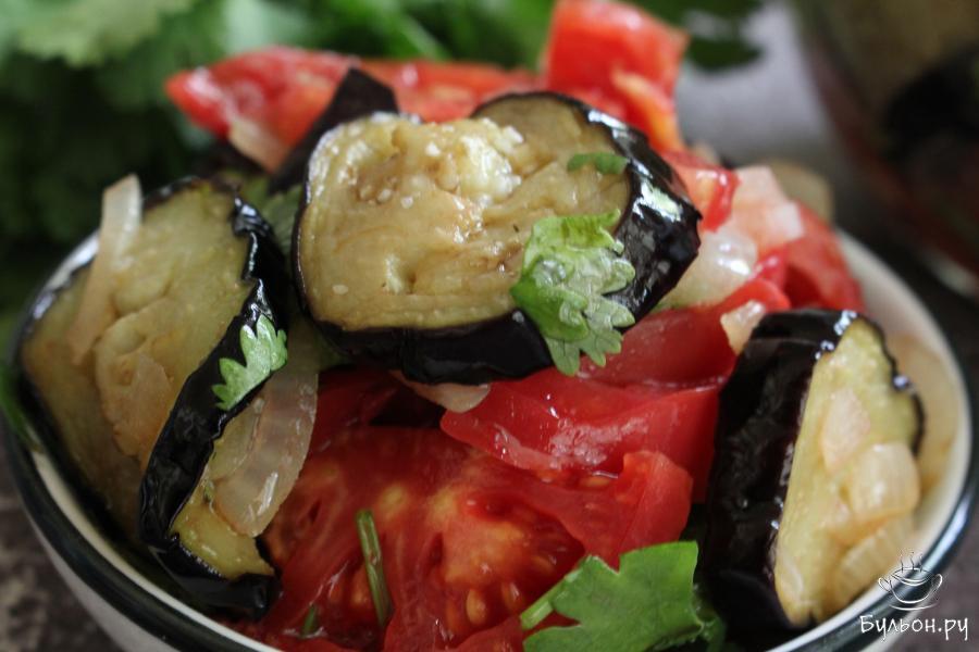 Закуска из жареных баклажанов с овощами по-армянски - это сочный и легкий салат-закуска, которая понравится всем, кто любит блюда с жареными баклажанами. Закуска получается яркая, вкусная, очень ароматная и полезная. Если у вас под рукой нет уксуса, замените его лимонным соком, наршараб можно заменить бальзамическим соусом. Такую закуску можно дополнить измельченным чесноком и добавить острый перец, если вы любите острые закуски.