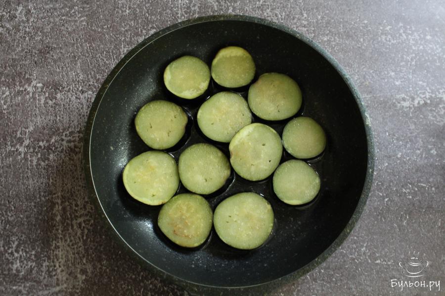 1. Баклажаны промыть, обсушить, нарезать кружочками. Обжарить баклажаны до румяного цвета, с двух сторон, на сковороде с разогретым маслом.