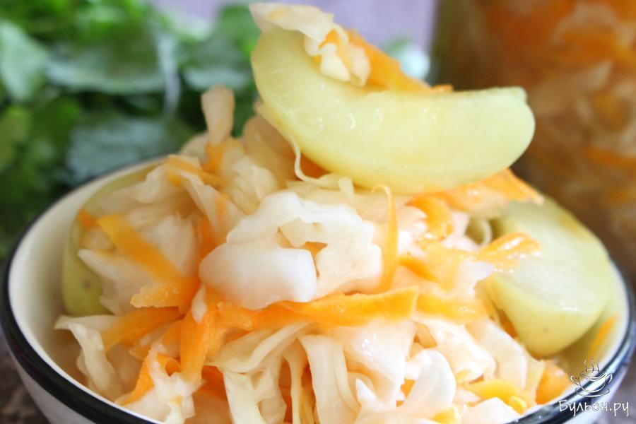 Квашеная капуста с яблоками в домашних условиях готовится очень просто. Капуста получается хрустящая, сочная, легкая, с гармоничным вкусом. Яблоки добавляют капусте аппетитный аромат и сами по себе они тоже очень вкусные в квашеном виде. Такую капусту можно подать, как самостоятельную закуску, а можно использовать для приготовления борща, салатов или выпечки. Квашеная капуста отлично дополнит постное или вегетарианское меню.