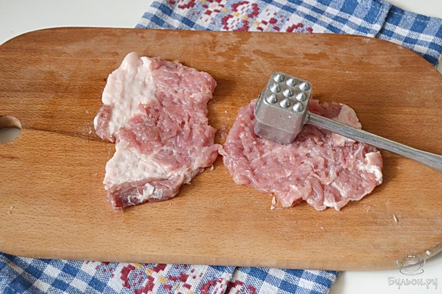 1. Для приготовления отбивных свиную корейку нарезать на стейки, толщина которых составляет 1-1,5 см. Отбить, так, чтобы толщина пласта уменьшилась, а площадь увеличилась.