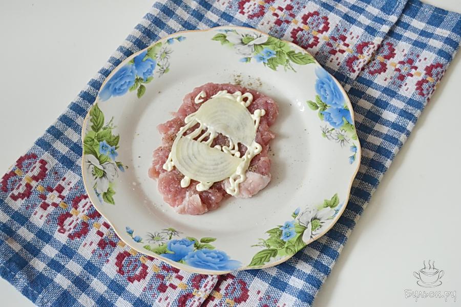 2. Мяско с двух сторон присыпать перчиком (можно использовать готовые ароматические смеси) и посолить.