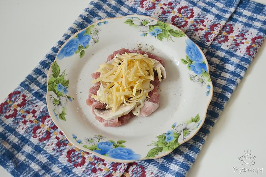6. Все отбивные с луком, сыром и шампиньонами выложить на противень, смазанный подсолнечным маслом. Поставить в духовку и запекать около получаса при температуре не выше 180 градусов.