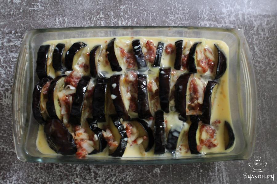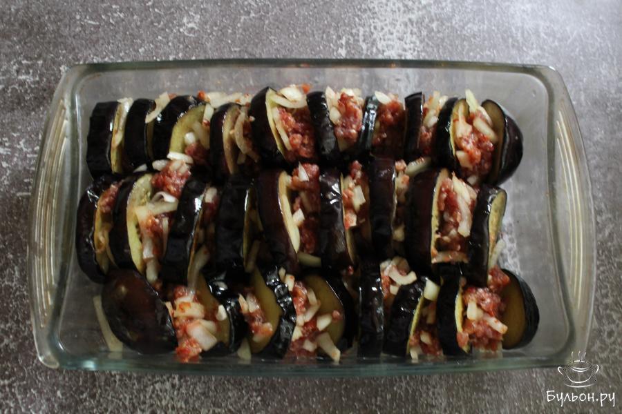 4. Выкладывать баклажаны рядками в форму для запекания, между кружочками баклажанов выкладывать фарш.