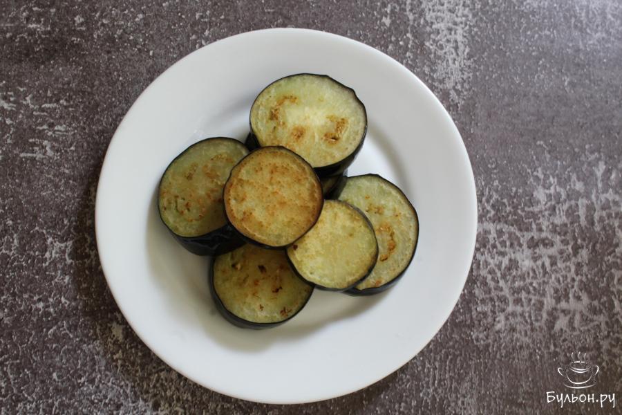 3. Баклажаны промыть, обсушить, нарезать толстенькими кружочками. Обжарить баклажаны на сковороде с разогретым маслом. Жарить баклажаны на сильном огне, до легкой корочки, но не до готовности!