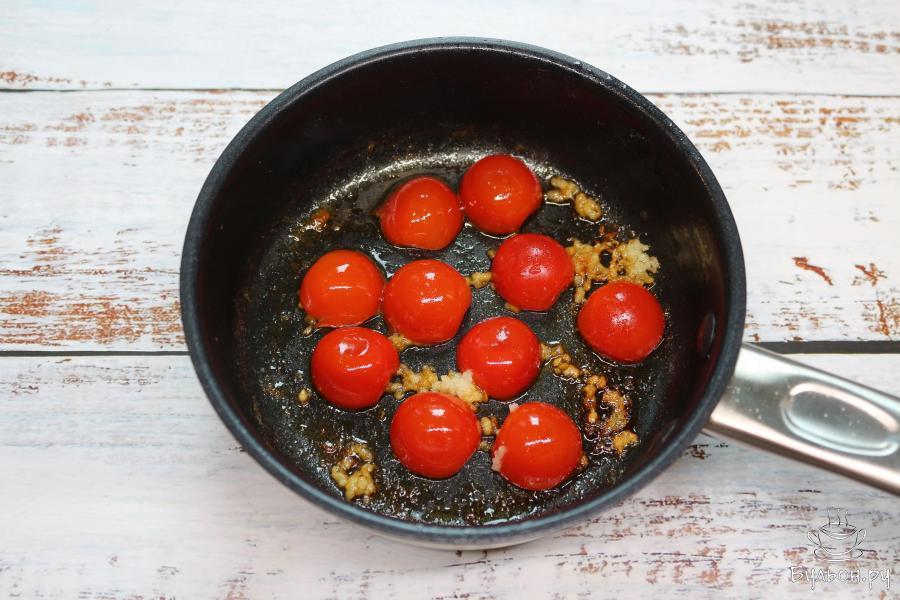 4. Черри разрежьте пополам, чеснок измельчите через пресс для чеснока. Обжарьте помидоры с чесноком на сливочном масле до мягкости.