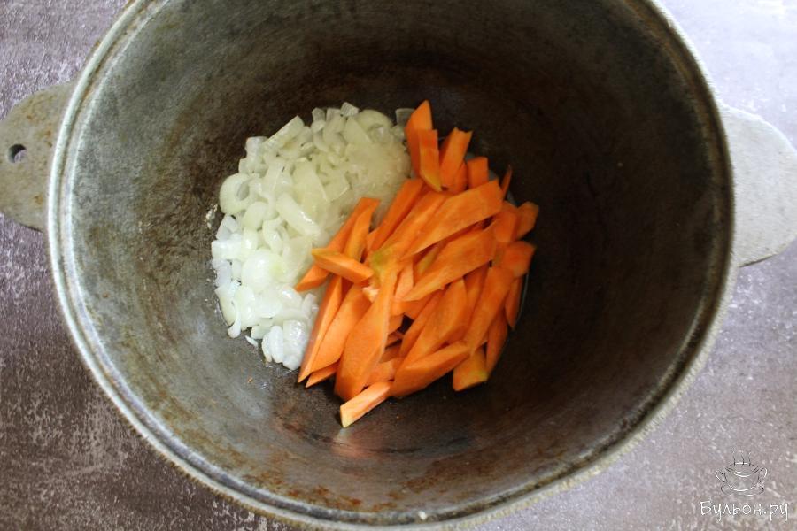 1. Все овощи почистить и промыть. Лук мелко нарезать и готовить пару минут в казане с разогретым маслом. Готовить это блюдо можно на небольшом огне. Морковь нарезать крупными брусочками и добавить в казан, готовить еще пару минут.