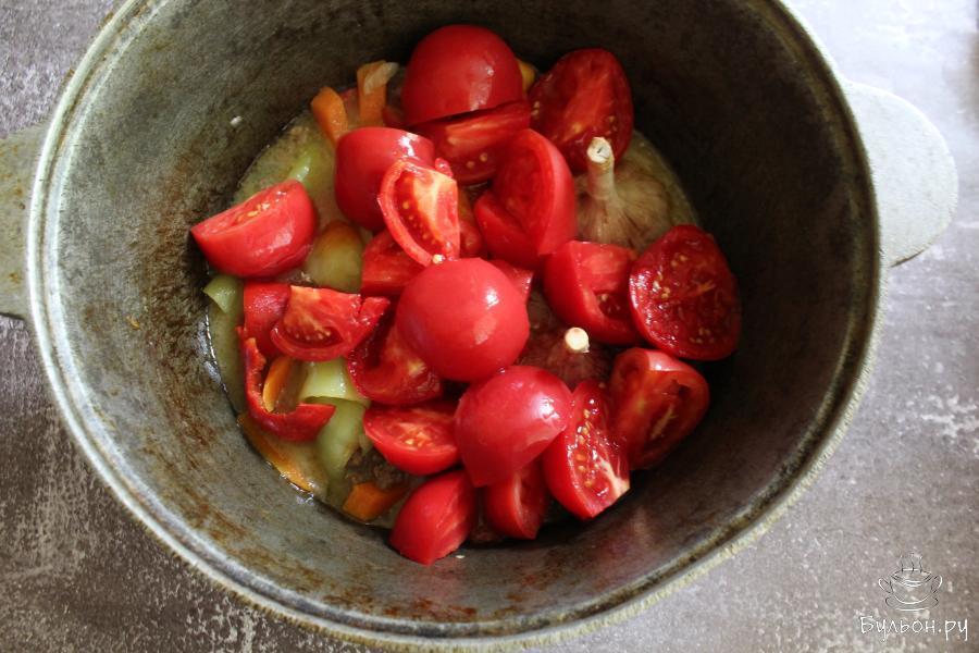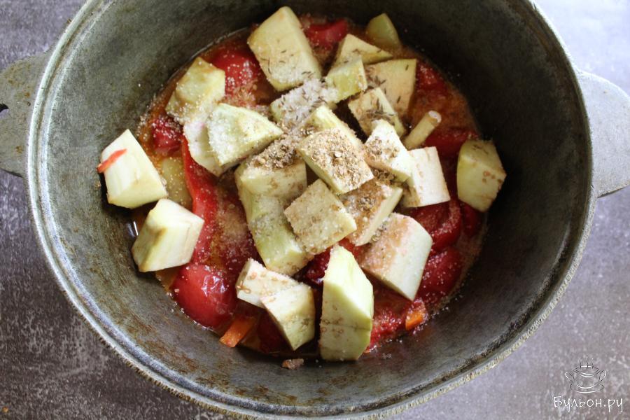 6. Баклажаны нарезать крупными кубиками, выложить в казан. Добавить соль, сахар, зиру и кориандр. Перемешать и тушить блюдо до мягкости баклажанов.