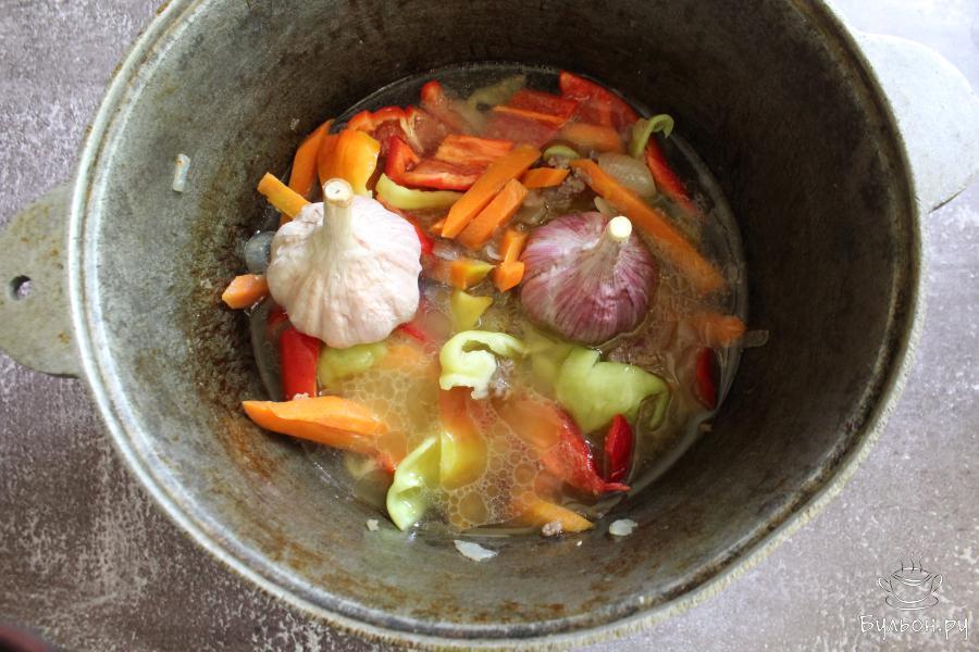 4. Влить воду. С чеснока снять верхнюю шелуху, срезать корешки, промыть чеснок и выложить его в казан. Готовить 15 минут, помешивать, чтобы чеснок был внизу.